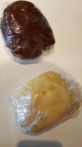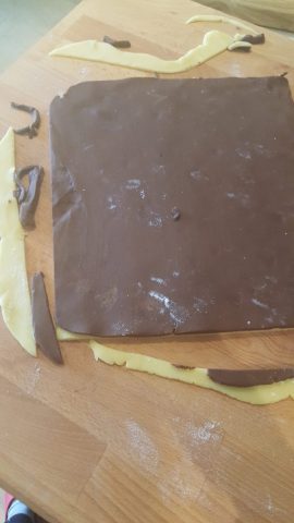 Dividetelo in due parti uguali e aggiungete i 25 gr di farina in uno e 25 gr di cacao nell'altro. Riponete i panetti in frigo a riposare per qualche ora, fino a che il composto non diventi più compatto. - Trascorso il tempo di riposo in frigo, stendete ciascuna frolla formando un rettangolo spesso 3 cm. Bagnate con dell'acqua una delle due e sovrapponetele l'una sopra l'altra. Ritagliate la pasta in modo da formare un rettangolo preciso.