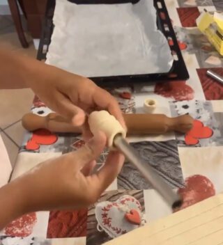 - Ho arrotolato l'impasto intorno al supporto cilindrico che avevo precedentemente imburrato fino a raggiungere la lunghezza desiderata e ho spennellato i cannoncini con uovo sbattuto con 1 cucchiaino di zucchero.