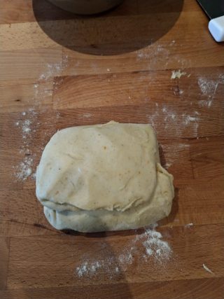 - Trascorso il tempo, sgonfiate l’impasto e procedete a fare una serie di pieghe; appiattite l’impasto fino a formare un rettangolo, piegate uno sull’altro i due lati per 1/3 del rettangolo; girate l’impasto di 90° e ripetete l’operazione. Ponete l’impasto in frigo fino al mattino successivo.