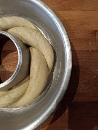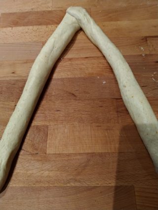 - L’indomani mattina prendete l’impasto dal frigo e aspettate una mezz’ora che si ambienti. Spezzatelo in 2 parti cui darete la forma di 2 filoni che unirete all’estremità.