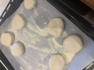 - Una volta raddoppiato, lo stendo con il matterello in uno spessore di circa 2 cm e lo coppo con un del diametro di circa 7 - 8 cm. Dispongo i muffii in una teglia ricoperta di carta forno e spolverata di semola (va bene anche farina per polenta). Ho spolverato i muffin anche sopra e ho ricoperto il tutto con uno strofinaccio aspettando il raddoppio.