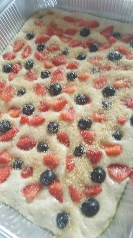 Trascorso il tempo, procedere con una serie di pieghe e riporre l'impasto a riposare fino al raddoppio. Una volta lievitata, stendere in un teglia oleata, spalmare la superficie della focaccia con del burro e incastonare dentro la frutta a piacere (io amo fragole e mirtilli).