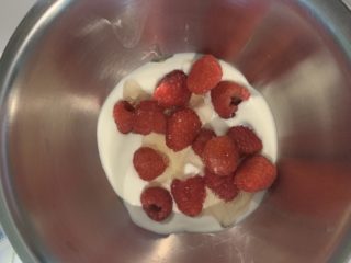 - Per prima cosa inserite in una ciotola i lamponi, lo yogurt e il miele.