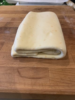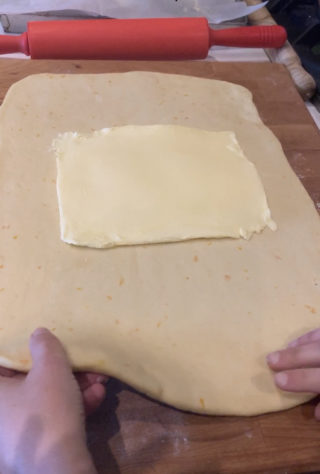 - A questo punto ho inserito il burro nell'impasto: ho steso l'impasto in un rettangolo di circa e ho posizionato il panetto di burro al centro. Ho ripiegato il bordo inferiore fino alla metà e quello superiore sopra quello inferiore ripiegato (fino a metà).Ho ruotato l'impasto di 90° e ho steso con il matterello. Ho poi riposto in frigo/abattittore per il riposo di 30 minuti. Per vedere come incassare il burro nell'impasto, puoi guardare il video nelle note!