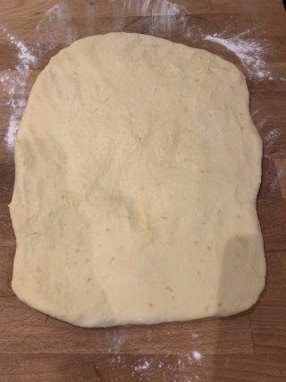 - Prelevate l'impasto e spolverate un asse di legno con un po' di farina. Stendete l'impasto con un matterello e allungatelo a forma di rettangolo.