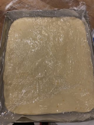 - Trasferite l'impasto in una teglia 30X40 ricoperta di carta forno e allungatelo per bene. Ricoprite con pellicola e ponete in frigo fino all'indomani