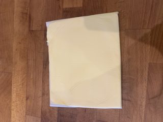 - Nel frattempo preparate il burro. E' importante che sia un burro bavarese, cioè un burro plastico che si riesce a stendere bene. Picchiettate con il matterello e poi stendetelo dentro un foglio di carta forno ripiegato su se stesso. La dimensione dovrà essere 15x20.