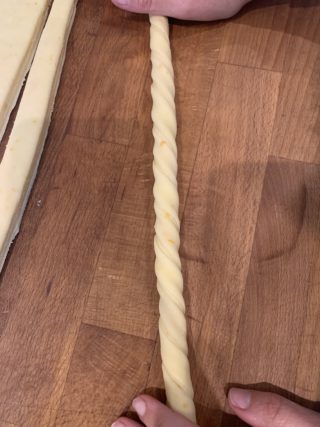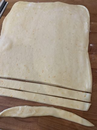 - Trascorso il tempo, ho steso l'impasto in un rettangolo di circa 30x50 e ho realizzato delle piccole strisce di 50 gr di circa 30 cm di lunghezza e 1,5 cm di larghezza.