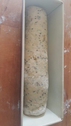 - Riponete l'impasto in una ciotola con un po' d'olio e lasciate riposare per circa 1 h. Dopo di che sgonfiate l'impasto, stendetelo a forma di rettangolo. Ripiegatelo su se stesso a mo' di rotolo e riponetelo in uno stampo da plumcake ricoperto di burro.