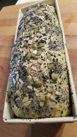 - Una volta che è lievitato (io ho impastato la sera e l'ho fatto lievitare per tutta la notte), spennellate la superficie con l'uovo sbattuto mescolato con il latte e ricopritelo dei semini a vostro piacimento. Infornate a 170° per circa 40 minuti.