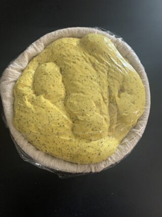 - Per prima cosa ho fatto autosili con le farine e l'acqua e ho lasciato riposare per circa 30 minuti. Ho poi aggiunto il lievito, la curcuma e i semi di papavero e ho incordato.Infine ho aggiunto il sale e incordato nuovamente.Ho messo a riposare in un contenitore oleato fino al raddoppio in massa.Al raddoppio, ho fatto la laminazione la preformare. Dopo 10 minuti ho formato il pane e messo in un cestino a riposare.Ho lasciato lievitare nuovamente a temperatura ambiente.Successivamente, ho rovesciato il pane, spolverato con farina e intagliato con la lama. Ho infornato per circa 40 minuti con vapore per i primi 10.