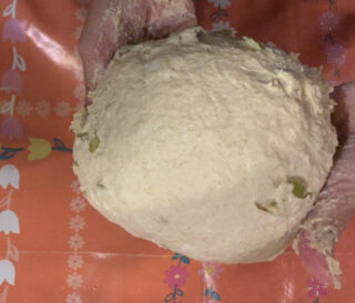 - Per prima cosa ho fatto autolisi per circa 30 minuti impastando grossolanamente acqua e farina fino a far assorbire tutta l'acqua alla farina. Ho poi aggiunto il lievito e impastato fino a incordare e infine il sale. Ho poi aggiunto le olive verdi che avevo lavato, asciugato e tagliato finemente fino a ottenere un impasto liscio e omogeneo.