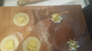 - Per assemblare le pardulas, stendete la pasta sottile, circa 3 mm, e riponete al centro un po' di ripieno (si alzerà in cottura visto che c'è un po' di lievito). Con le mai richiudete la pasta facendo dei pizzicotti alla pasta formando dei piccoli cestini. Infornare a 180° per circa 20 min.