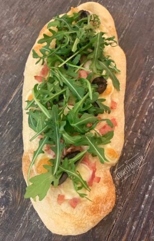 - Infornare su pietra refrattaria alla massima temperatura del forno di casa (io 250° C) e cuocere per il 90% il prodotto (ci vorranno dai 3 ai 5 minuti, dipende dal forno