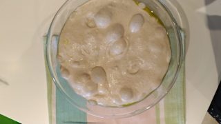 - Unire l'acqua alla farina in modo grossolano e lasciar riposare per circa 30 minuti (autolisi). Trascorso il tempo, aggiungere il lievito madre e il lievito di birra e impastare qualche minuto fino a che il composto non diventa omogeneo. Aggiungere il sale e dopo pochi minuti, l'olio. Questo è un impasto ben idratato, non facilissimo da gestire. Per questo vi consiglio di gestirlo in ciotola: oleate per bene una ciotola e riponete l'impasto facendo sempre in ciotola un giro di pieghe ogni 10 minuti per 2 volte. Fatti i giri di pieghe, riporre l'impasto in frigo per 18 ore.
