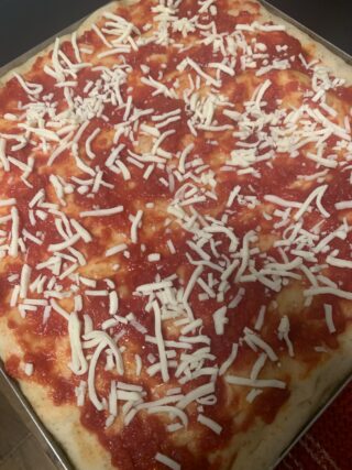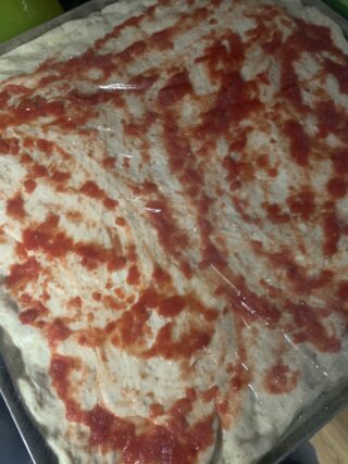 - Una volta che l'impasto è ben lievitato e vedete che il livello è il doppio, potete infornare. Io poso la teglia direttamente sulla refrattaria e imposto il forno alla massima temperatura.Cuocio la pizza per alcuni minuti e poi finisco di posare la polpa di pomodoro e la mozzarella e proseguo con la cottura fino a che la mozzarella non è completamente sciolta (attenzione a non bruciarla.