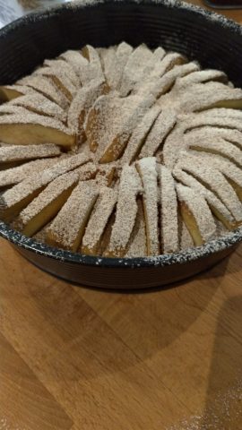 - Ora tagliate e sbucciate le mele avendo cura di eliminare completamente il torsolo. Tagliatele a spicchi e disponetele sopra l'impasto (devono anche un po' affondare). Spolverate il tutto con zucchero a velo e cannella e infornate a 180°C in forno statico preriscaldato per circa 45 minuti (ricordate sempre la prova stecchino).